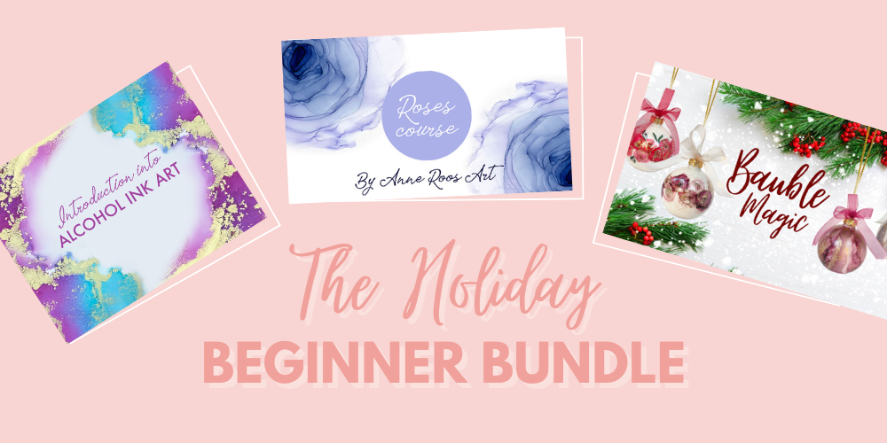 The Holiday Beginner Bundle takes you from the basics to expert-level skills! Start with the Introduction to Alcohol Ink Art, then master the technique of creating beautiful roses, and finally learn to apply your skills to craft stunning baubles!