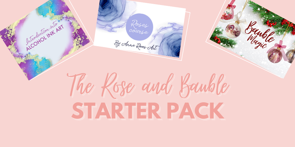 The Rose & Bauble Starter Pack takes you from the basics to expert-level skills! Start with the Introduction to Alcohol Ink Art, then master the technique of creating beautiful roses, and finally learn to apply your skills to craft stunning baubles!
