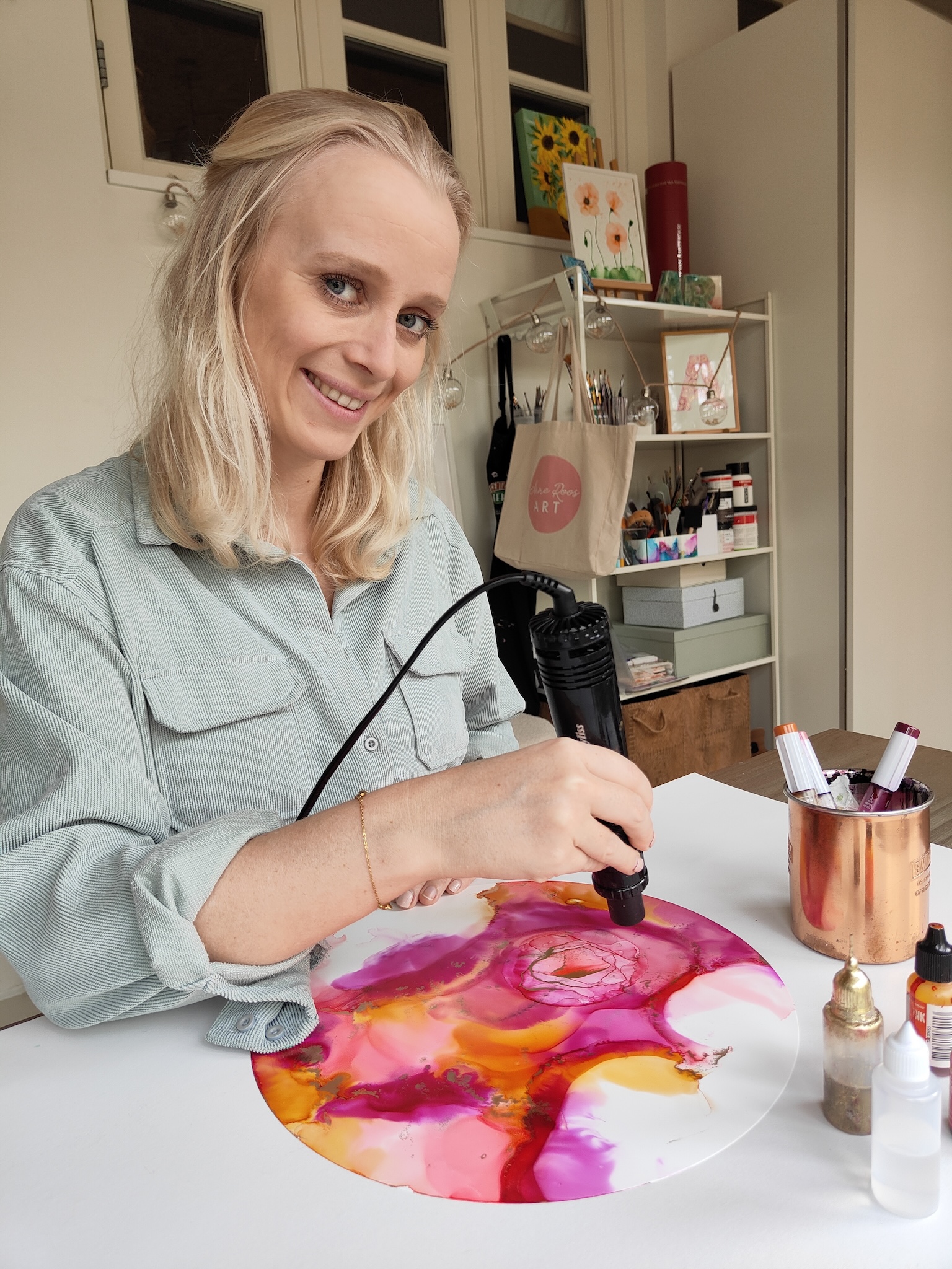 Hi there! I am Anne Roos, an alcohol ink artist living in the Netherlands. My own alcohol ink art journey began back in 2018, and I have been addicted since. I have helped over 2000 creatives from all over the world in improving their alcohol ink art skills. I know how frustrating the process can be in the beginning, so please know: Good things take time! I am here to guide you through this process and give you step-by-step demonstrations and a wealth of advice that will help you improve your techniques and get control over those inks. I get so much positive energy from making my inks flow around on paper and I hope I can bring some of that positive energy to you!